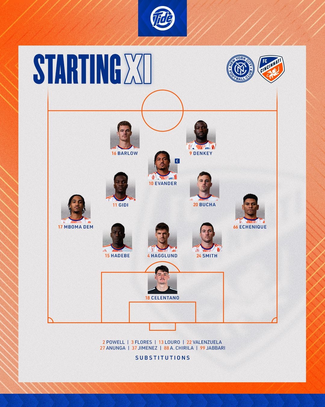Update 7:00 pm ET: Lineups out, with New York City unchanged from the team that lost 2-1 to Charlotte at Citi Field last weekend.